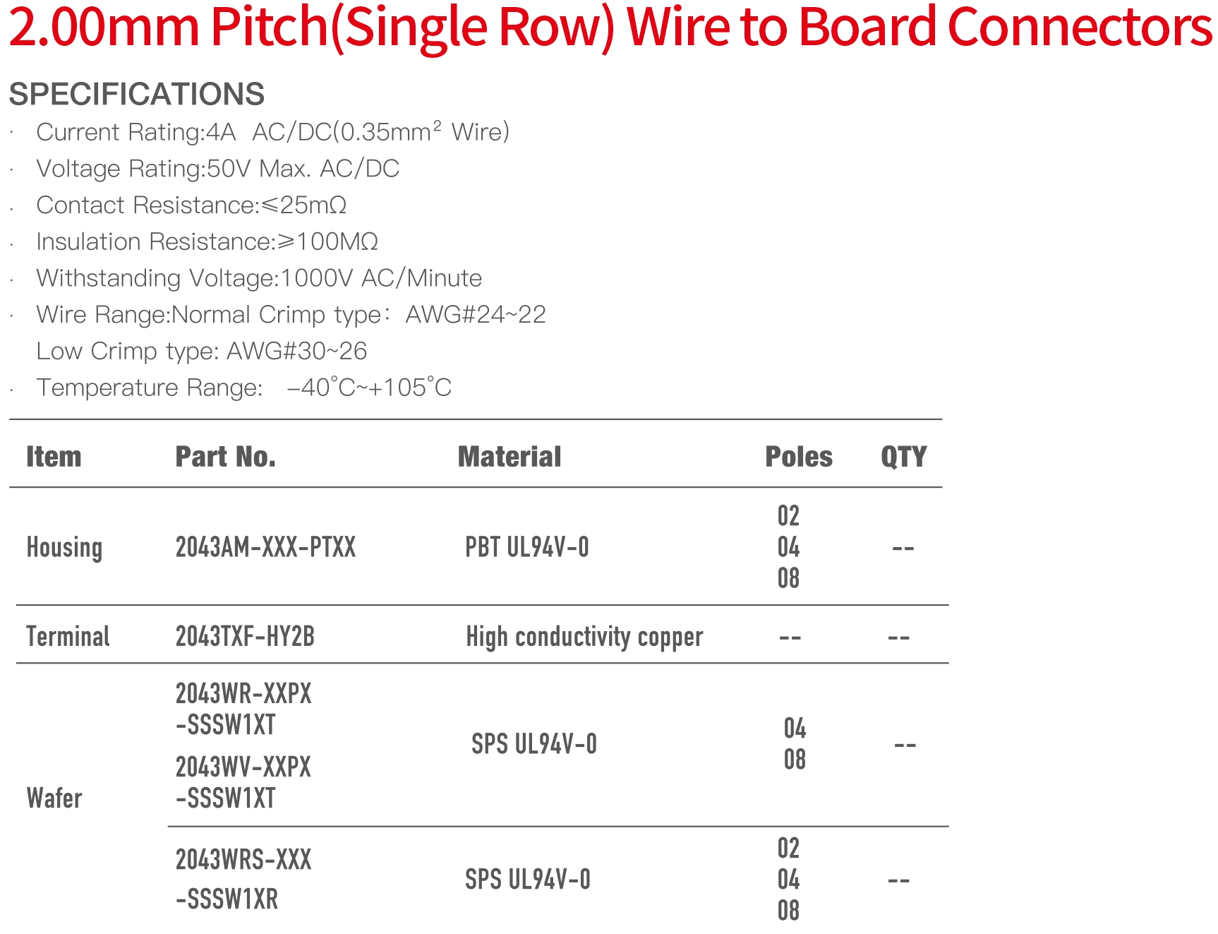 2043 Single Row Series 2.00mm Pitch (.079") Wire To Board Connectors